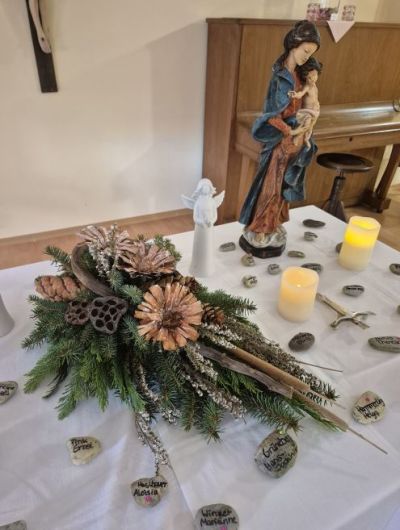 Zu guter Letzt wurden die Steine zur Kapelle gebracht und mit dem Allerheiligengesteck niedergelegt.