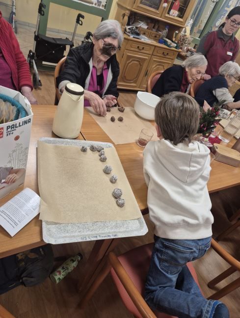 Kinder und Senioren bereiten gemeinsam weihnachtliche Pralinen zu. Diese werden zusammen in der kommenden Woche bei unsere Weihnachtsgeschichte genossen.