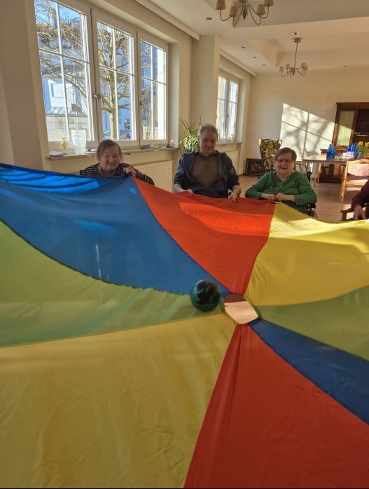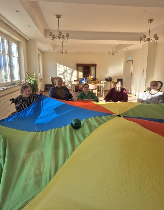 Die leuchtenden Farben des Schwungtuchs sprachen alle Sinne an und versetzten unsere Seniorinnen und Senioren für einen Moment in eine andere, heitere Welt.